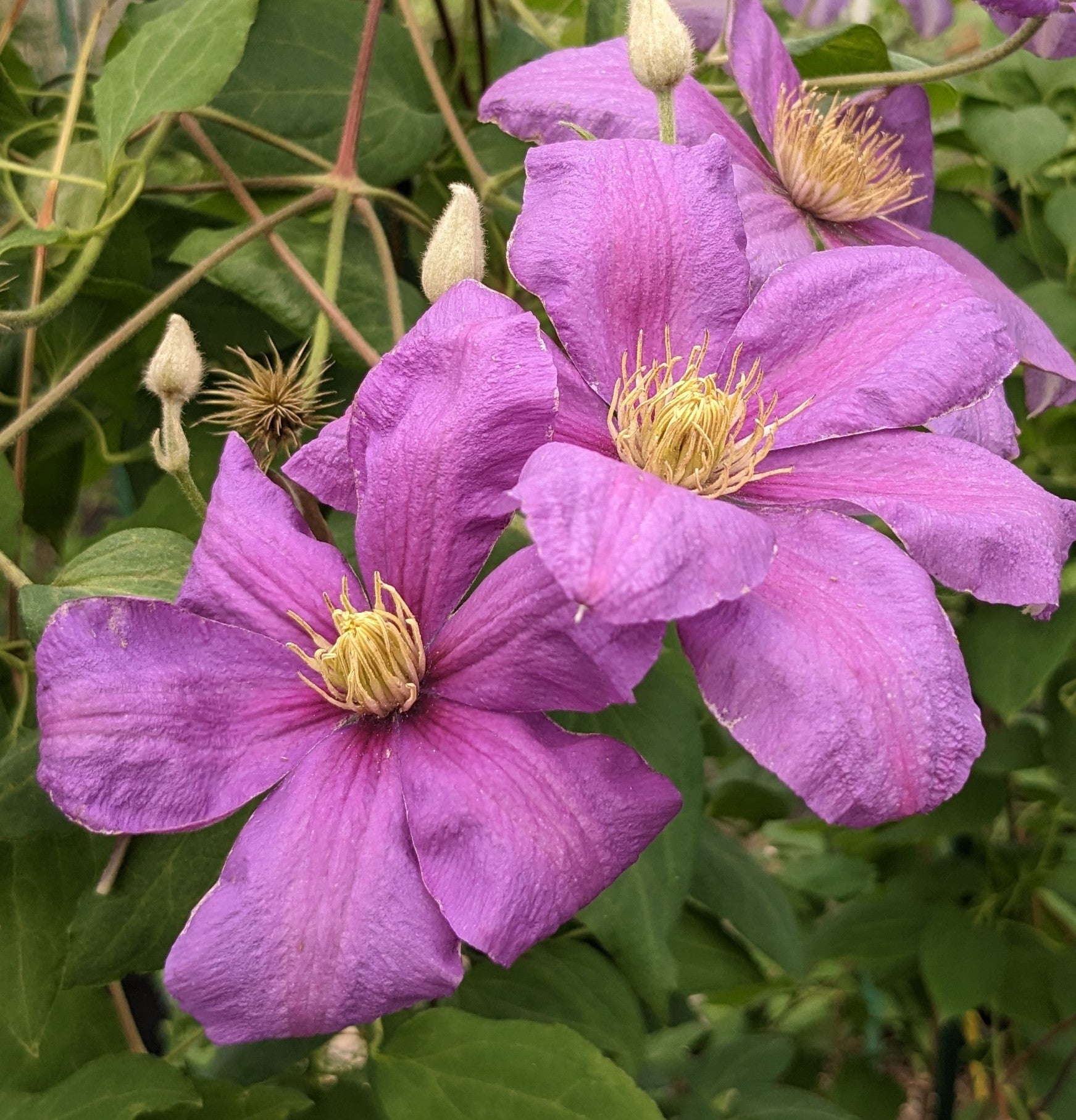 Clematis Twilight is offered in a full gallon size with free shipping! It has large mauve flowers with a splash or red in the margins of the sepals. It blooms in late spring and again in late summer to early fall.