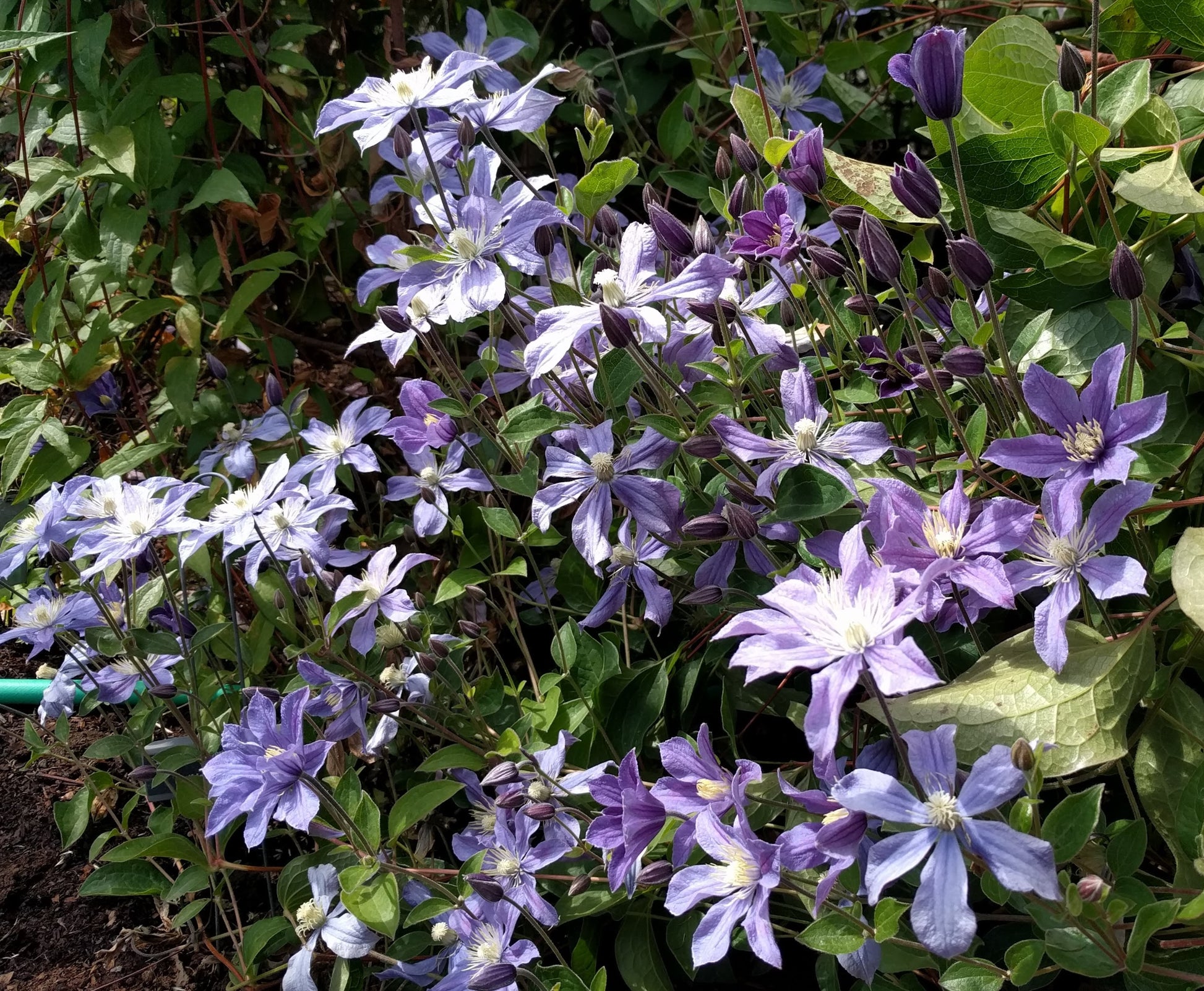 Clematis Arabella is offered in a full gallon size with free shipping! It is a beautiful hybrid that combines the herbaceous scrambling habit of integrifolia with the large, upturned flowers of a large-flowered clematis. Arabella’s blooms are constant all summer and begin as a deep blue-mauve color before fading to a delicate pale blue. Its flowers are 3.5 inches across and their everblooming nature make this a must-have Clematis! Works trained on a trellis, in a patio container, or allowed to ramble in your border! Simply cut it back near the ground in winter and watch it happily spring back every year for another show that you can enjoy for the whole growing season. Most clematis, including Arabella, have a light-weight structure and can grow atop or through other plants without harm. Fretwell, England, 1990.