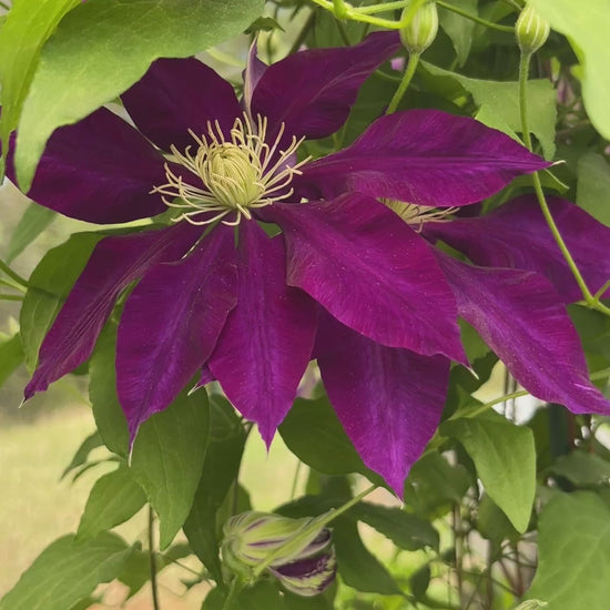 Clematis Hayate is offered in a full gallon size with free shipping! It has open, pinwheel flowers of a velvety plum red color. This brand new, compact selection from Japan can bloom all summer. Hayakawa, Japan, 2008.