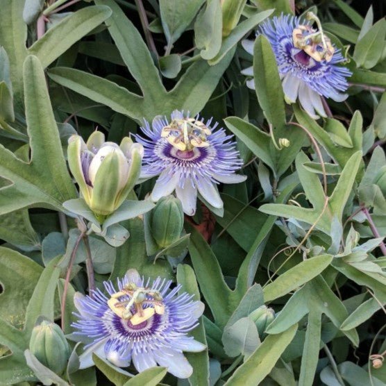 P. Mooreana is offered in a full gallon size with free shipping! Mooreana has a hardiness and look similar to P. caerulea. Its petals are white, and filaments are decorated with rings of alternating white, blue-violet, and lavender, with purple at the very center. Mooreana is a fragrant flower with vigorous stems. Can be grown in a container, on a trellis, and in a hanging basket. The blue-gray foliage adds a nice texture of color when planted alongside other plants. P. Mooreana does well as a houseplant, or can simply be brought inside for the winter. Hardy in zones 8 through 11, P. Mooreana can reach up to 40 feet!